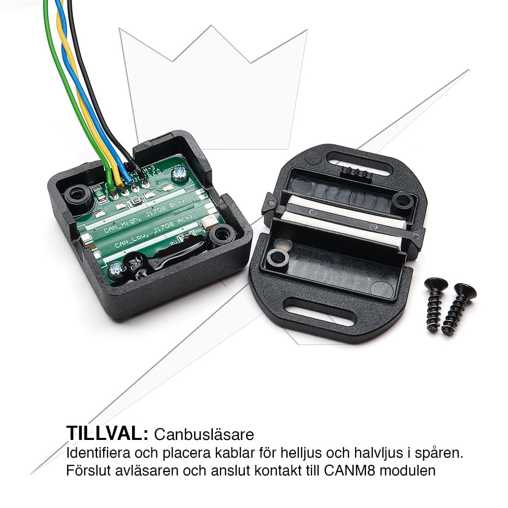 För bilar där ingen helljussignal finns tillgänglig för styrning av extraljus eller ljusramp via reläkablage eller XBB.CANM8 ansluts till bilens ODM port där den identifierar helljussignalen.
