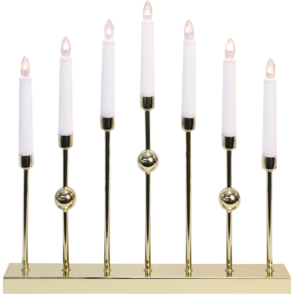 Stilren metalljusstake i mässing. Ljusstaken har 7 ljuskällor med mysigt sken. En dekorativ ljusstake att ha i hemmet.