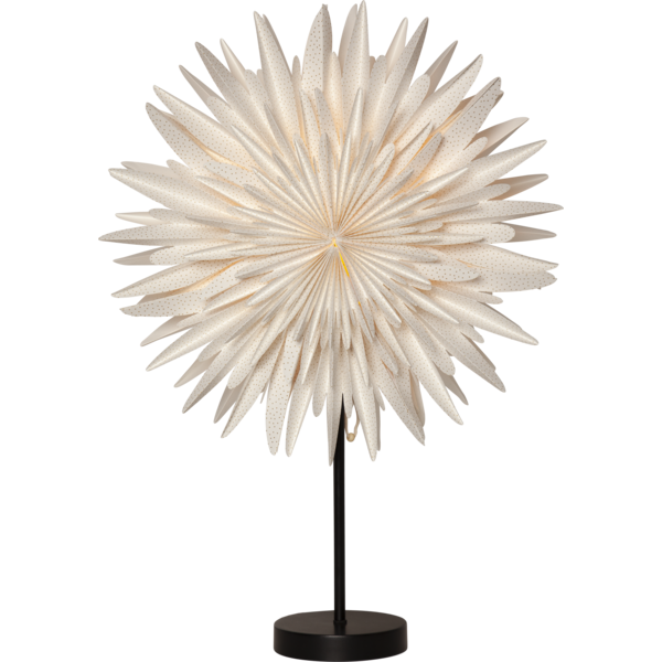 Fantastisk pappersstjärna på svart fot . Stjärnan är vit med guldprickar och tillverkad av tre lager veckat papper. Konturen har runda flikar som gör att stjärnan ser busigt vintrig ut. Adventsstjärnan på fot skapar en perfekt julstämning och ger hemmet den där speciella julkänslan. Kan placeras både i fönster och på en skänk.