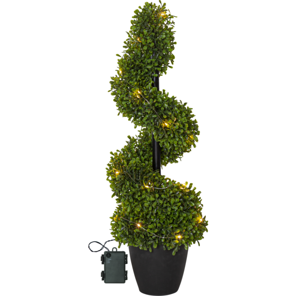Buxbom spiral med höjden 65 cm är en konstgjord formklippt buxbom gjord av PE plast. Med 20 varmvita ljuspunkter lyser den vackert upp och går bra att använda som ett välkomnande träd utomhus eller inomhus i en lobby eller hemma i en hall. Den är vacker och naturtrogen och man slipper klippa om den varje år. Den drivs av 3 AA batterier och har även timerfunktion och när brytaren är på timerläget lyser trädet i ca 30 dagar. Den går bra att använda utomhus eller inomhus. Batterier ingår ej.