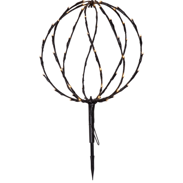 Dekorativt svart klot med 64 varmvita ljuspunkter, 30cm i diameter. Ger ett härligt ljus till din trädgård. Produkten kan användas som både hängande och stående, markspettet är avtagbart och det finns en krok för upphäng, för att inte belasta kabeln använd en kedja eller rep att hänga klotet i. Batteribox för utomhusbruk. Klotet är ihopvikbart vilket sparar utrymme när den inte används.